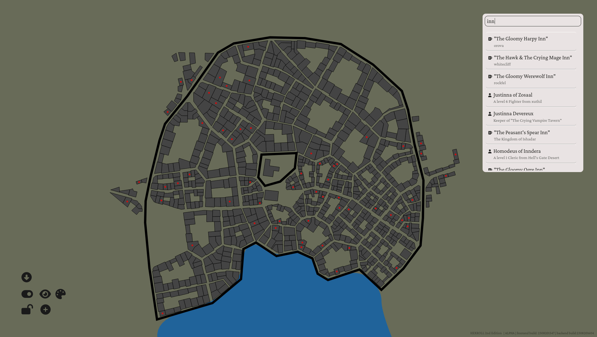 Visit cities, towns and villages with annotated maps courtesy of WATABOU, together with generated NPCs, taverns, inns, shops and services for your PCs to make use of.